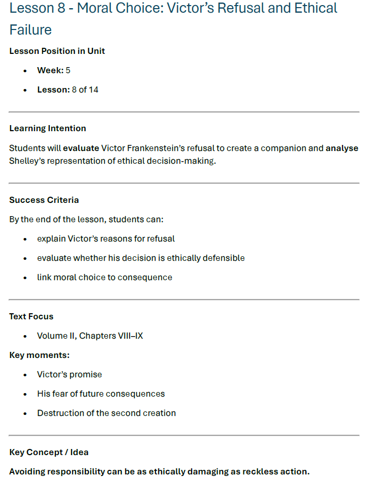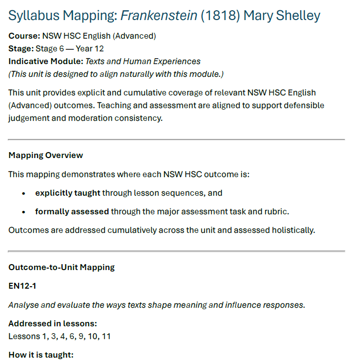 This Complete Teaching Unit provides a ready-to-teach, NSW HSC-aligned program for senior English teachers who want to teach Frankenstein with confidence — without rebuilding everything from scratch.