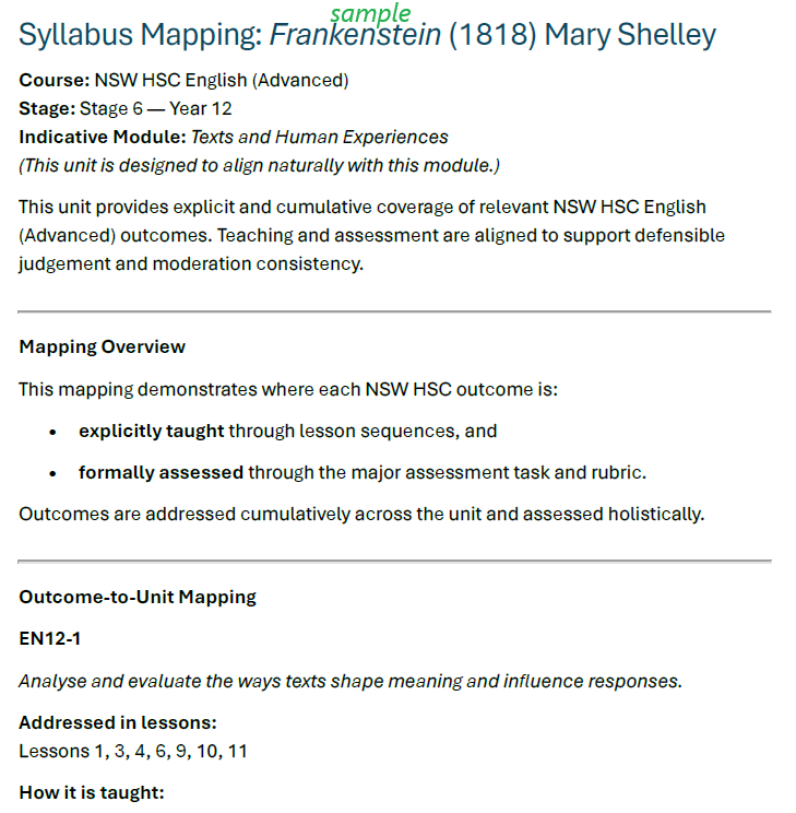 Complete Teaching Unit; Unit overview and learning objectives; 14 fully developed lesson plans; Unit-level support bank; NSW HSC syllabus mapping; Assessment and moderation Pack; Student assessment task sheet; Marking rubric (A–E descriptors); Outcome-to-rubric mapping; Delivered as PDF + editable Word files.